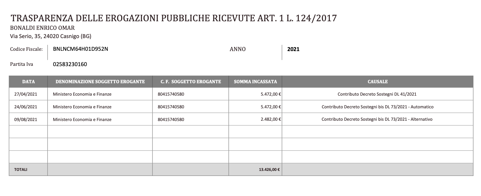 Riportiamo erogazioni pubbliche ricevute dalla nostra azienda negli anni 2021 e 2022